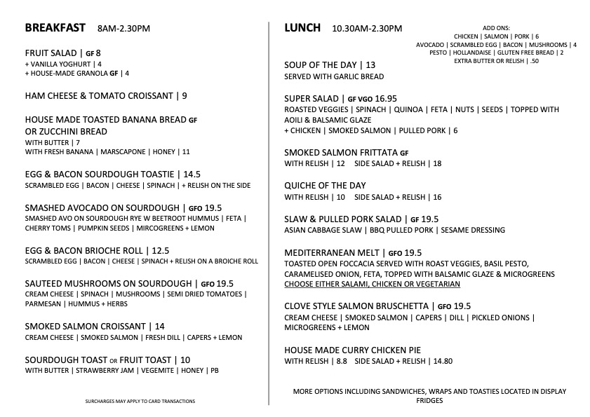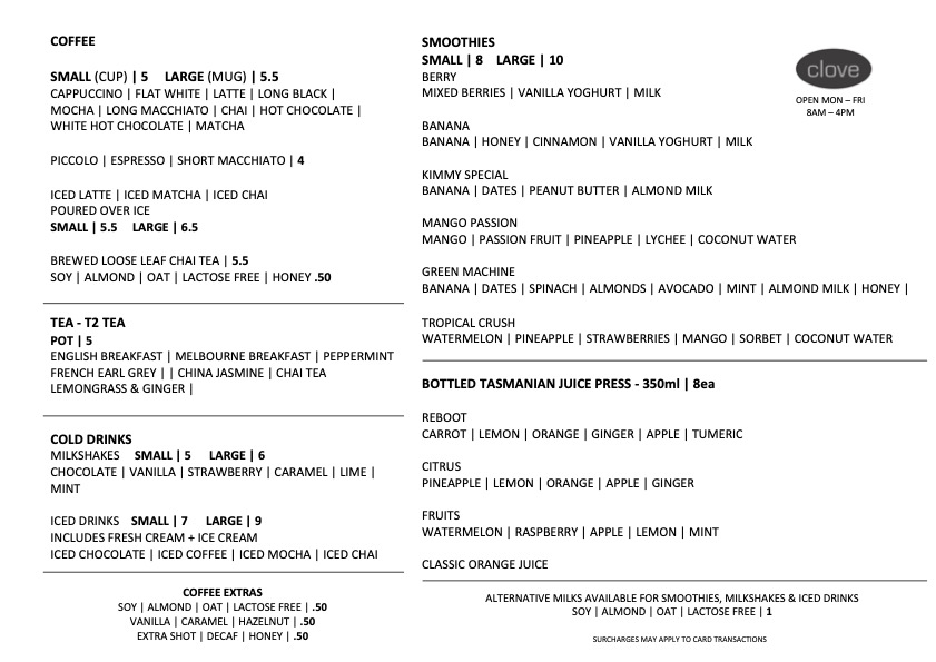 Introducing the menu at Clove Cafe, located in Newstead, TAS, is a delightful culinary journey that promises freshness and flavor. This charming cafe stands out with a diverse selection of lunch offerings, including the comforting Soup of the Day for A$13.00, a vibrant Super Salad for A$16.95, and the savory Smoked Salmon Frittata at A$12.00. For those seeking heartier options, the Slaw & Pulled Pork Salad is a must-try at A$19.50.